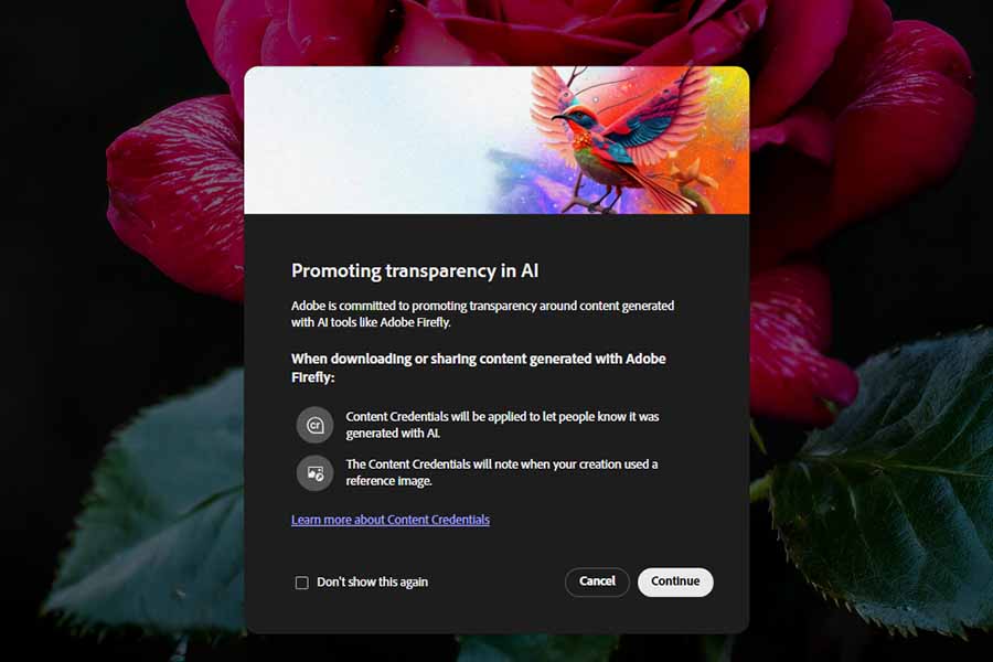 Another addition is the Content Credentials, FireFly's way to credit the source. Through Adobe Creative Cloud, this labeling mechanism applies metadata to the generated portrait, classifying whether the image was AI-generated or based on a reference image and, in that case, the citation to that image.