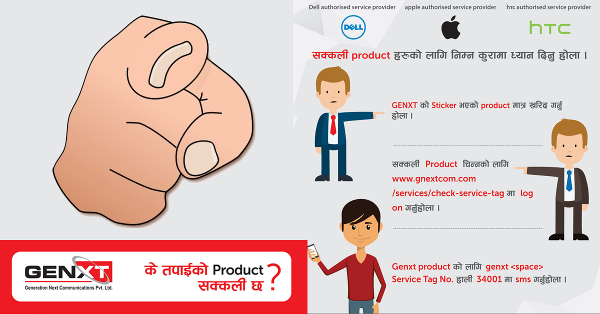 Generation Next Communications Pvt Ltd (GENXT) is the name designated as an authorized distributor of Apple and Dell products in Nepal. Generation Next Communications Pvt Ltd is currently dealing with genuine products of Dell, Apple, and HTC brand. Moreover, Netgear routers and switches, Savoy watches, power banks and tables come clinging to the list of available products. If you wish to confirm the device as a genuine product from the GENXT, you can go to http://gnextcom.com/check-service-tag-imei/ and enter service tag/IMEI number of the device and the truth will be unveiled.