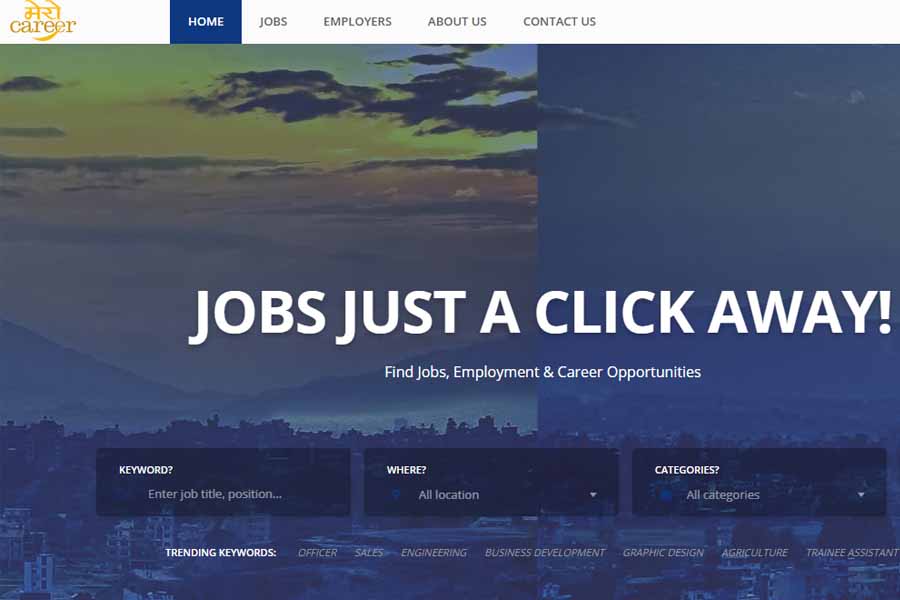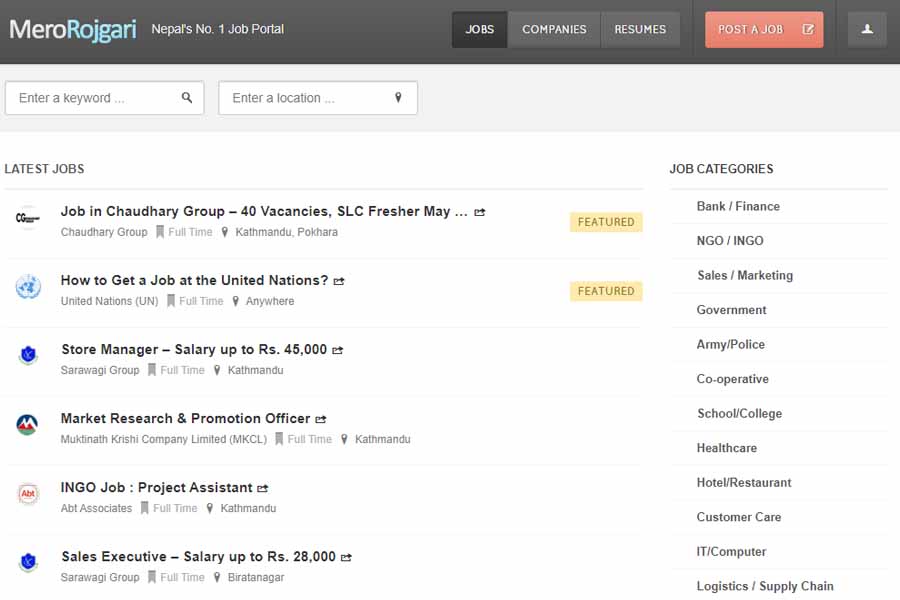 Launched in 2010, MeroCareer is another well-known name in the Nepalese job portal arena. Managed by its parent company "J&T Associates", you can find job-listings from some of the biggest financial institutes and other business houses. The website is pretty minimalistic and has a clean design. Users can scroll for jobs based on up to 3 variables: keyword, job category, and location.