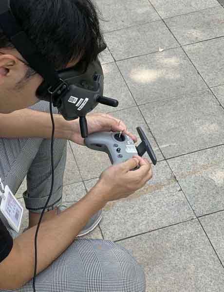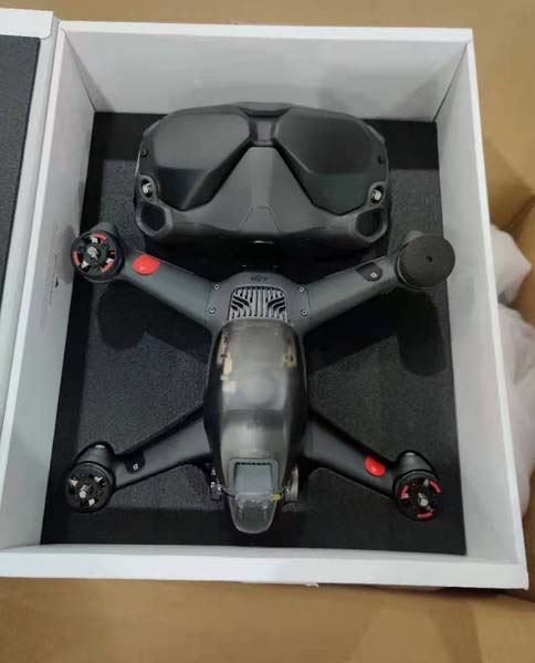 The drone looks different than anything from DJI, ever. It has a two-tone design with red patches on two of the four motors. The picture of the googles on the box shows four antennas placed at different angles. Likewise, the controller features two joysticks and two trigger buttons. Between the two triggers, there is an antenna that allows it to communicate with the drone.
