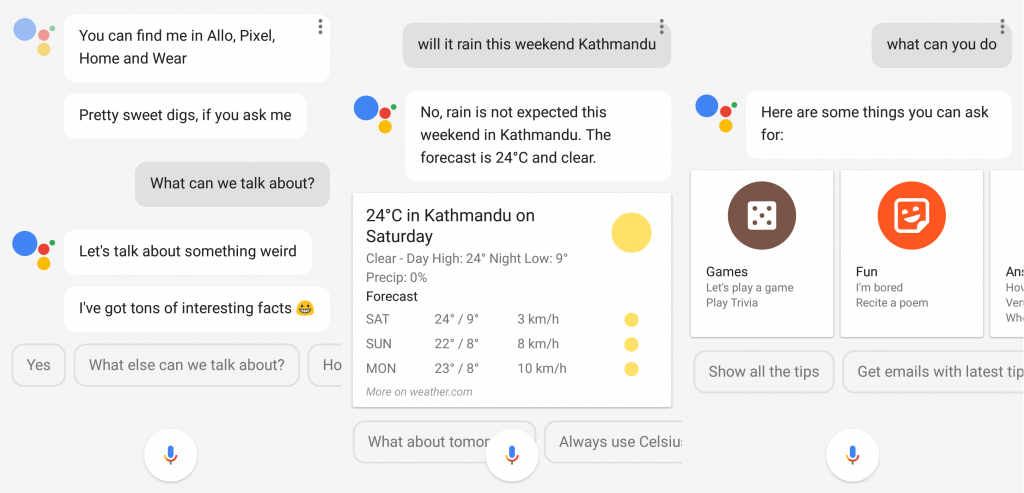 Google Assistant does so by remembering your past queries and facts like your birthdays, favorite foods and so on and comes up with personalized results based on that. You can have more humanly conversation and play games with the Google Assistant unlike in Siri and Cortana.