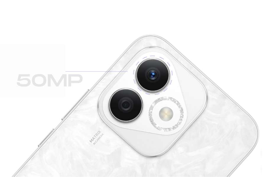 As I mentioned earlier, the design of the Honor X60i is very flashy. It has marble-like patterns across its back panel. This reigns true for the Coral Purple, Cloud Blue, and Moon Shadow White colours. Meanwhile, for the folks who like it plain and simple, there is the Magic Night Black option with a monotone finish. The camera bump on the phone looks like a play button and has an LED light enclosed by a crystal ring. It is also IP64 dust and water-resistant.