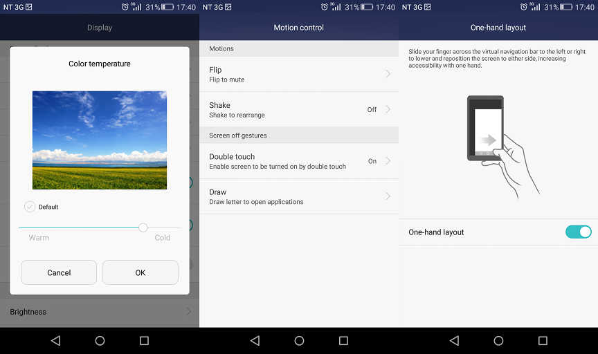 However, There are 2 notable weaknesses with the display of P8 lite: Firstly, the screen radiates a cold color temperature that inclines to have inaccurate color reproduction. Secondly, the display is quite dim, and normally you have to keep the brightness at 100% to use it comfortably. Despite inaccurate color reproduction and dimness, the display touch sensitivity is good overall.