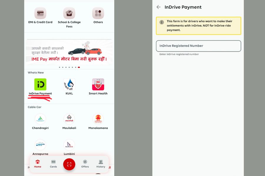 This rapidly growing ride-hailing service has now partnered up with one of the leading digital wallets in the country, IME Pay. If you peek through the homepage of the IME Pay app, you should notice the inDrive payments option. It's already been here for a few days as long as I have noticed. But turns out, that this feature is now only available for drivers in order to settle their accounts.