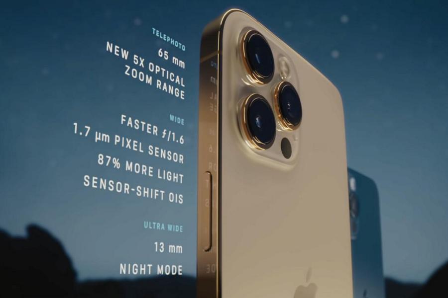 - Back Camera: Triple: • Ultra-wide: 12MP f/2.4, 120° FOV, 5-elements lens, 13mm focal length • Wide: 12MP f/1.6, 7-elements lens, 26mm focal length, Sensor-shift OIS • Telephoto: 12MP 6-elements lens, OIS, f/2.2, 65mm focal length • LiDAR scanner for AR workloads, night portraits, etc.