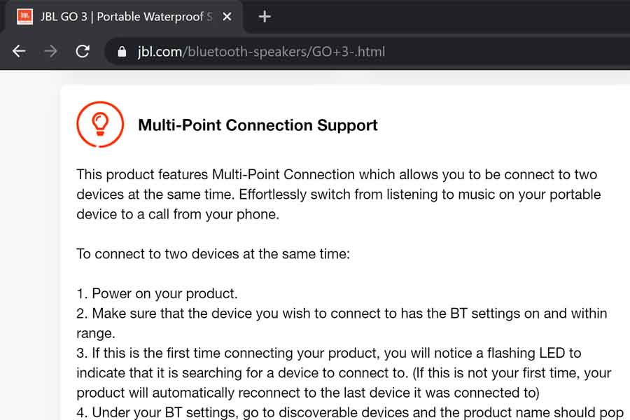 Another thing I’d like to mention is that even though the official support page of the JBL GO 3 mentions its multi-point connection capability, it actually doesn’t. To be honest, the claim seemed too good to be true for a budget speaker and our tests proved rightly so. Maybe, that section on the website made its way there because of an error—a rather misleading error.