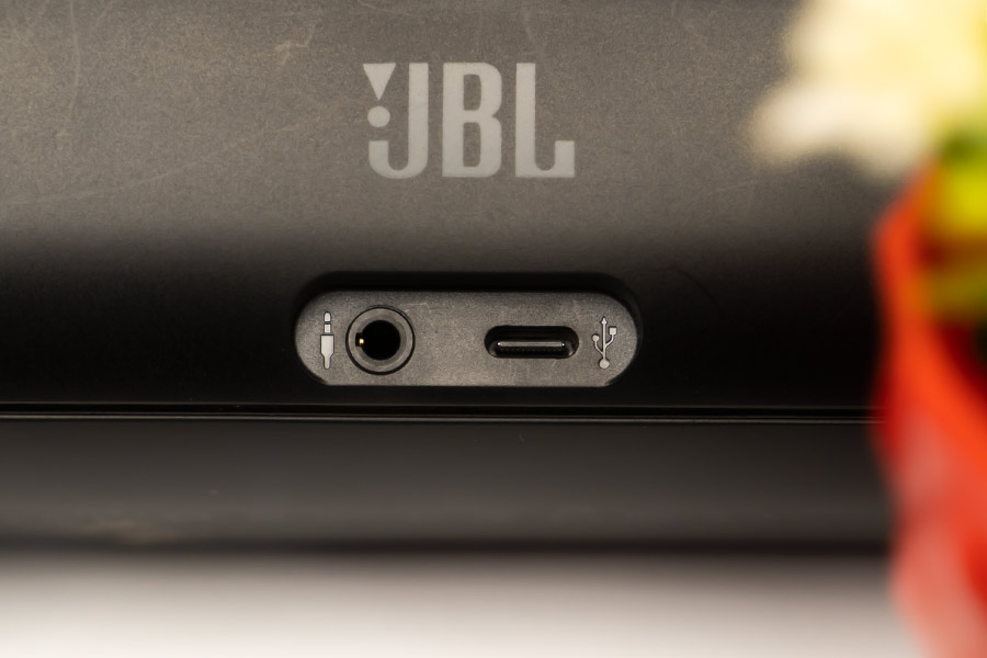 Sides are more like “glastic”. The left side also houses the power button that has a tiny red decal. The button is tiny and non-glowing but I had no problem finding it as it is pressed into the surface. On the opposite side, the JBL logo has been carved out of the smooth surface.