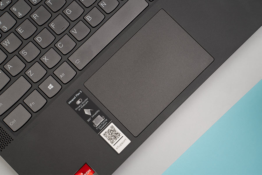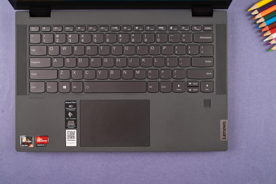You can lock the Function key as well—which has a dedicated LED indicator to denote its status. The up/down keys share one standard keyspace while the entire directional keys integrate Home, End, PgUp, and PgDn shortcuts too. In terms of security, the Lenovo Flex 5 has a Windows Hello-certified fingerprint reader down the right arrow key which is fairly responsive and fast.