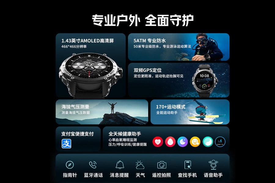 The watch supports 170+ sports modes and includes dual-frequency GPS for outdoor tracking. Then you also get stuff health monitoring which covers heart rate, blood oxygen (SpO2), sleep tracking, and stress monitoring. There's also breathing training with inhalation and exhalation exercises, plus health reminders throughout the day.