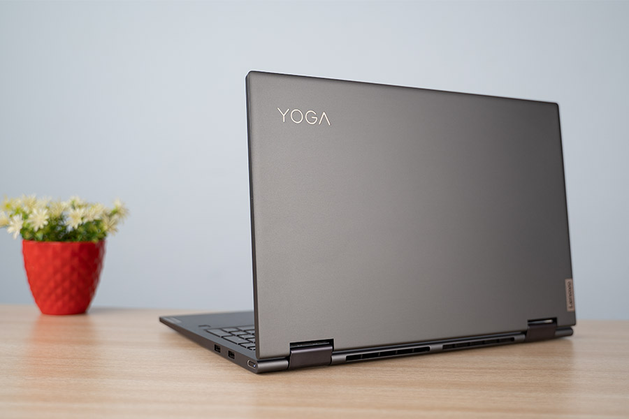 Moving on. The Yoga 7i is one well-built device. Featuring an all-metal aluminum build quality, this laptop looks premium and professional enough to blend into corporate settings. Available in either slate grey or dark moss finish, it’s fair to say that both color options exude premium aesthetics. The lid features a sublime branding at the top-left corner while Lenovo overcompensates its (albeit minimal) logo on the keyboard deck and the lid.