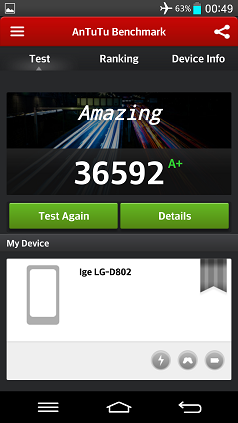 LG G2 sports a Qualcomm's latest and greatest quad-core processor- “the Snapdragon 800” that is clocked at 2.26 GHz, Adreno 330 GP, 2GB RAM and 32GB of Internal storage, of which 24 GB is available to the user. In terms of connectivity, there is LTE, 3G, Wi-Fi ac, NFC, Bluetooth 4.0 and micro-USB 2.0. The LG G2 is strikingly fast. There is no lag while opening apps, multitasking, playing high end games and boot time is insane. It takes about 5-7 seconds for this phone to boot. The LG G2′s boot time is the best I have ever seen.