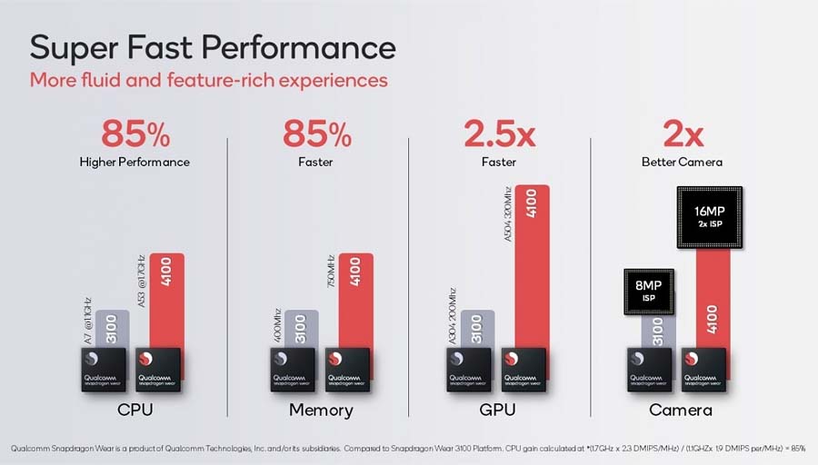 Compared to its predecessor, the Wear 3100 (28nm) from back in 2018, Qualcomm says Wear 4100 offers 85% better CPU and memory performance, 2.5x faster GPU, and 2x better camera experience.