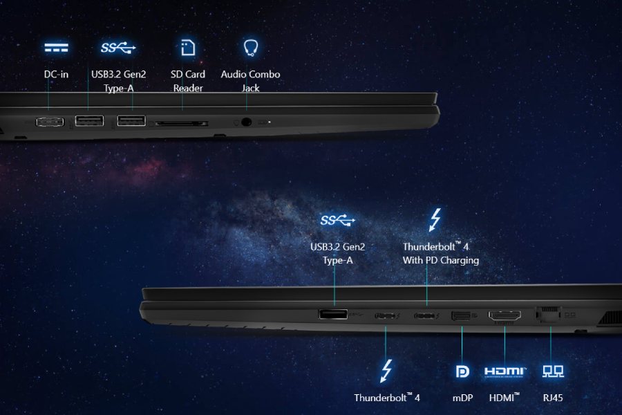• I/O Ports: 1x Type-C (USB / DP / Thunderbolt 4), 1x Type-C (USB / DP / Thunderbolt 4), 3x Type-A USB3.2 Gen2, 1x SD Express Card Reader, 1x HDMI 2.1, 1x Mini-DisplayPort, 1x RJ45