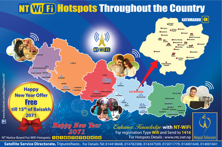 Nepal Telecom (NT) has been offering free Wi-Fi Internet service based on WiMAX technology in different places all over Nepal. To find the List of NT Wi-Fi hotspots-CLICK HERE