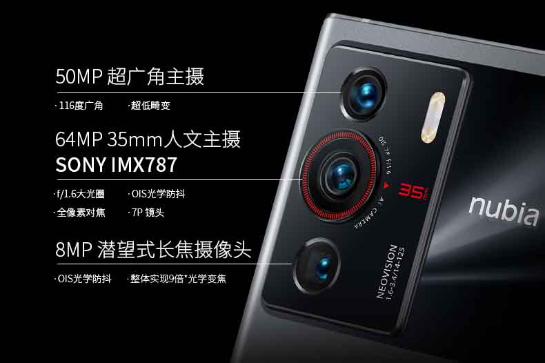 Nubia Z40 Pro is the first phone to come equipped with the Sony IMX787 primary camera. It’s a 64MP shooter with a 1/1.3” sensor and a 35mm equivalent lens. It uses 4-in-1 pixel binning to shoot 16MP pictures natively.