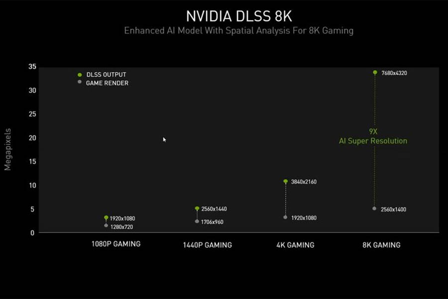 While none of the games natively support 8K, NVIDIA's DLSS 2.1 technology allows games to run at this high resolution. DLSS 2.1 offers an "ultra performance mode" for 8K gaming with up to 9X scaling. That is, it can render internally at 2560x1440 pixels and then upscale the result to 7680x 4320 pixels.