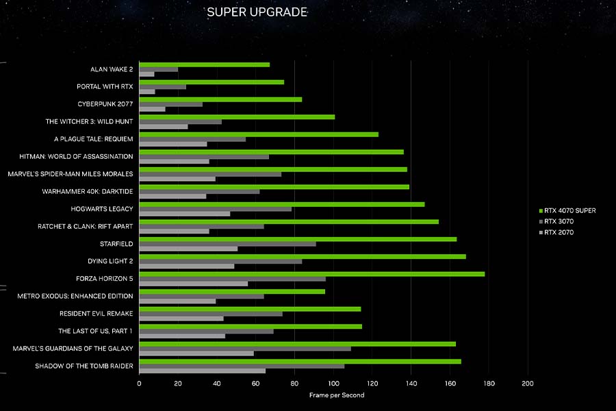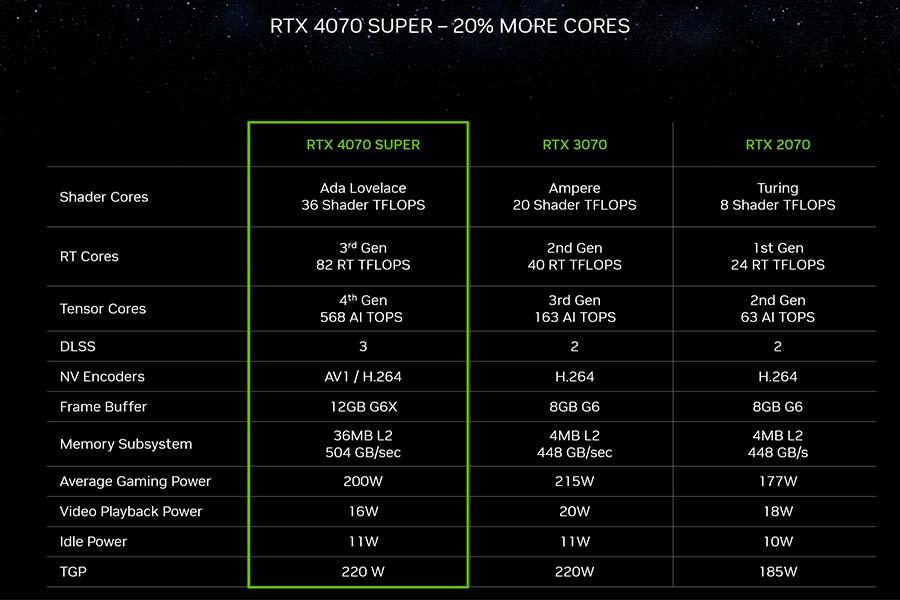 As such, it might be a worthwhile upgrade for those with an RTX 3070 or RTX 2070 card. It seems to offer almost double the performance (or a lot more with Frame Gen) over the older cards in the graph NVIDIA presented.The new NVIDIA RTX 4070 Super even outperforms the previous generation RTX 3090 using a fraction of the power at 220W. (RTX 3090 operates at 350W)
