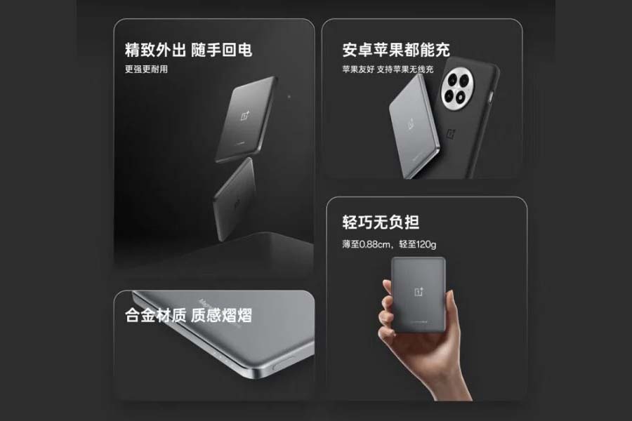 The OnePlus Magnetic Power Bank features a dark, minimalist design with the OnePlus logo and “Magnetic Power Bank” text. It is lightweight at 120g and measures just 0.88 cm thick at its thinnest point. Additionally, the power bank is constructed using 5-series aviation aluminum, ensuring a durable yet sleek finish.