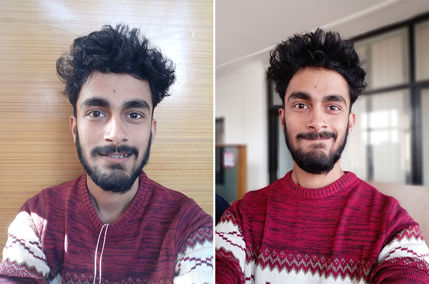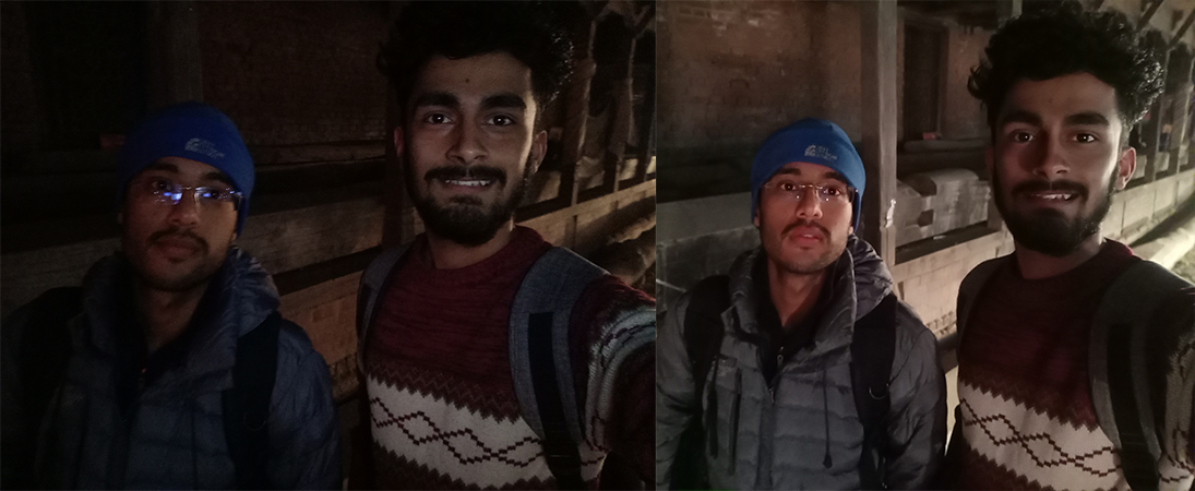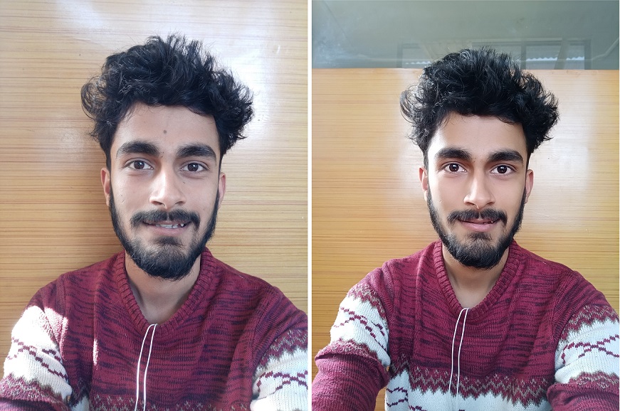 Taking a normal picture, everything looked good, I was impressed by the fact that the camera could brighten up a picture when I was taking the picture on the left. On the right, however, OPPO amazingly erased the mole on my forehead. I have never seen a single smartphone do this. And look at my skin tone. Why would anyone like a picture with such skin tone? And why are my eyes sparkling? Yes, a couple of people on Instagram might like this new AI compatible selfie shooter, but is it for everyone? Not at all. And under low light setup, the picture I took from normal mode looks much much better than the one taken from the beauty mode as you can see in these two pictures.