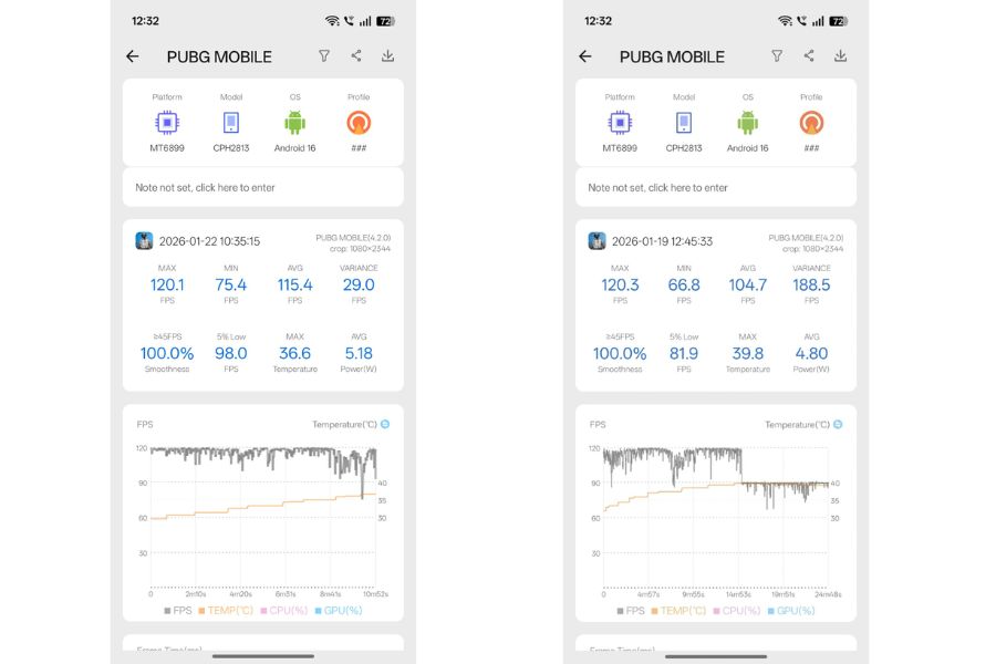 For short gaming sessions, it’s completely fine. As you can see from this screenshot Playing PUBG for around 10 minutes, I got around 115 FPS on average, but playing again for 25 minutes, the average fps was just 104. So, maybe it's because of the compact size or maybe because of the lack of a proper vapor chamber cooling solution, it heats up quite badly during prolonged gaming sessions or even when using it outdoors on a sunny day.