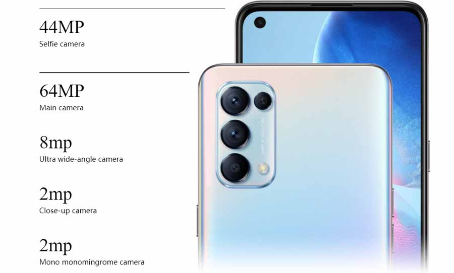 Reno5 4G flaunts a quad-camera setup at the back. The setup is led by a 64MP primary camera, accompanied by an 8MP ultra-wide sensor. There are additional two 2MP sensors for macro photography and monochrome effects. On the front, there is a 44MP selfie camera.