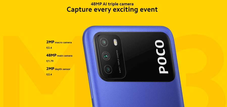 Talking about the cameras, there are three sensors in the rear panel and one in the front. The primary camera has been bumped to 48MP from 16MP on the Poco M2. The primary camera has a 1/2” sensor and an aperture of f/1.79. It is accompanied by a 2MP macro lens and another 2MP sensor for the portrait sensor.