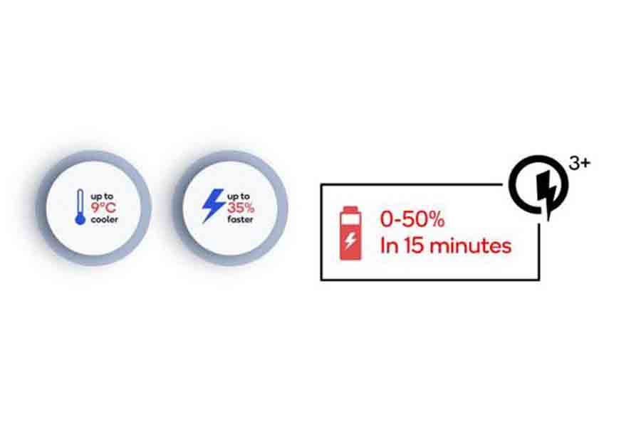 The Quick Charge 3+ will be able to charge the device from 0 to 50% in just 15 minutes. The charging speed is 35% faster than QC 3.0, and the whole charging process is 9-degree Celcius cooler than its predecessor. It feeds scalable voltage to the system with a step size of 20mV and supports the standard Type-A to Type-C charging cables. It is also backward compatible, meaning that QC 3+ charging accessories can also be used to charge devices with QC 3.0 and older. Safety features of the Qualcomm Quick Charge 3 Plus includes integrated cable power capability/identification among others.