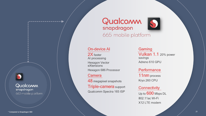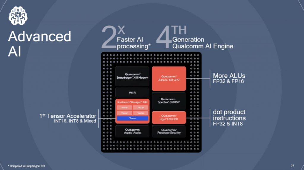 On the GPU side, Qualcomm is claiming that the SD665 offer 20 percent better power efficiency than the SD660. Although Qualcomm didn’t specifically mention the boost in the GPU performance, the generation jump of Adreno 512 to Adreno 610 cues a significant change. In terms of ISP (Image Signal Processor), there is not a considerable enhancement. However, the Snapdragon 665 comes with the 3rd generation of Qualcomm AI engine, which offers up to 2x faster AI on-device processing capabilities than the SD660. So with such a capable AI engine on the board, SD665 will show its proficiency on the scene and object recognition. Also, this new chip promises improvements in the places where Computer Vision like facial recognition is used.