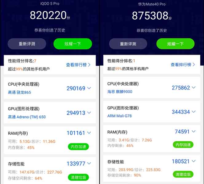 Since the test has been conducted on a prototype device, the figures will change slightly when the SD 875 starts appearing on retail units. Similarly, benchmark results are also affected by factors like RAM size and type of memory used. Here, the prototype device had 12GB of RAM compared to Mate 40 Pro’s 8GB. Similarly, Mate 40 Pro used a faster memory as evident by the score of the memory test (180,521 > 125,135).