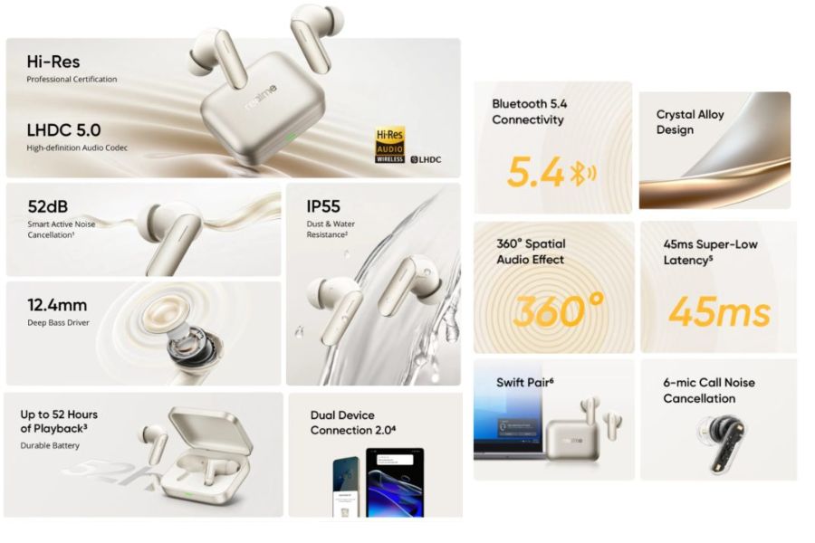 The earbuds offer 52dB ANC (Active Noise Cancellation) and AI deep call noise reduction. There are a total of 6 microphones for noise cancellation and clear calls. You can connect it to the Realme Link app which provides control customization, EQ effects, as well as other tweaks! They also support dual-device connection 2.0 and Bluetooth 5.4 for pairing.
