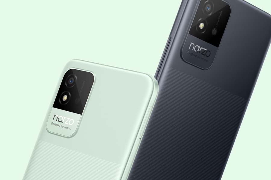 Realme has gone with a dual-tone finish for the rear panel of Narzo 50i. The bottom two-thirds of the phone is covered with diagonal stripes, whereas the top half has a clean finish. It is also home to a rectangular camera bump and a speaker grille.