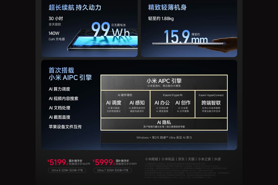 The laptop includes six major AI capabilities with 37 AI-driven experiences, such as AI computing adjustment, AI document search, AI scanning, and AI cross-screen sharing. It supports Apple device file transfer and Xiaomi HyperOS Connect.