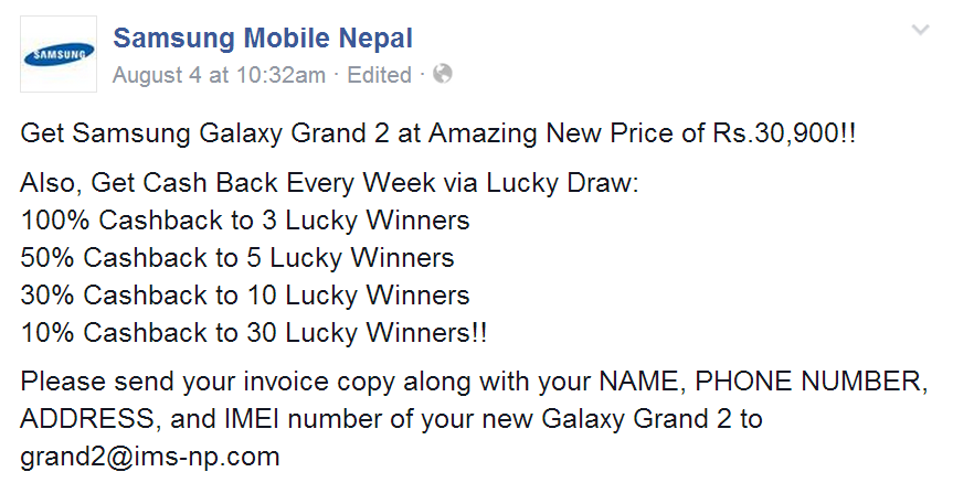 Grand 2 was launched here in Nepal for a hefty price of Rs.36,900 here in Nepal, but now IMS (International Marketing Services), the authorized dealer of Nepal, has slashed back their initial price of Rs. 36,900 to Rs.30,900 (Rs. 6000 off) with opportunities to win cash back.