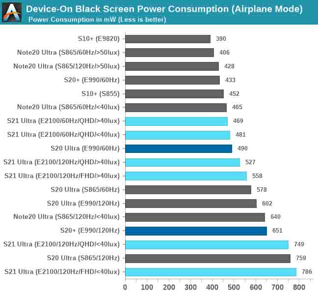The tests conducted by AnandTech show that the display panel on the S21 Ultra is more energy-efficient than its predecessors. Thus, the display on the Samsung Galaxy S21 Ultra will do better especially if you love using the phone in Adaptive mode and at higher brightness levels.