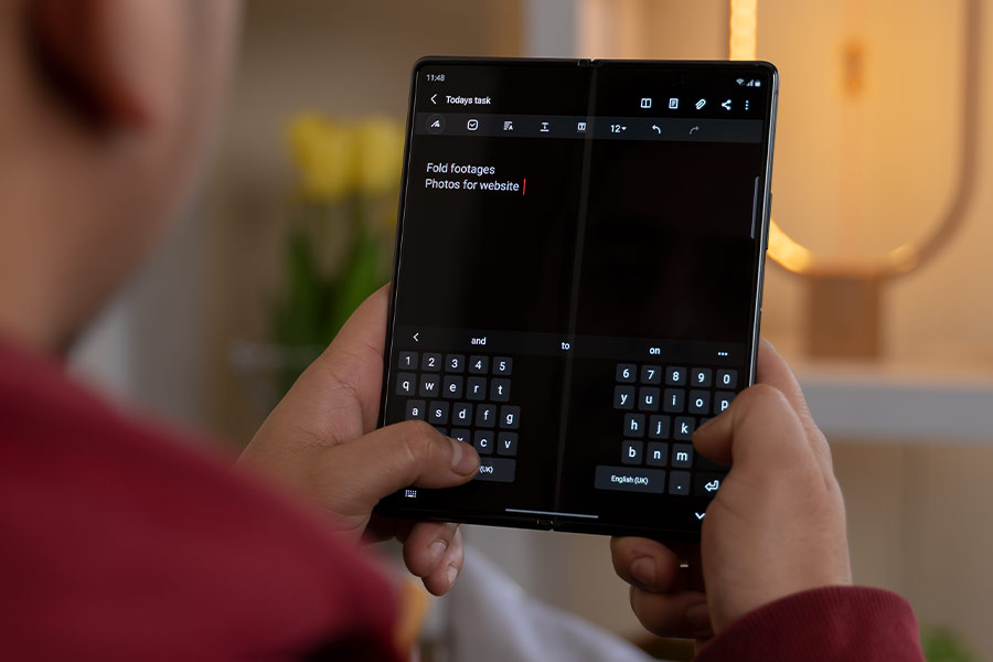Okay, now allow me to address the elephant in the room—the crease. Yes, it’s there, and yes it could be distracting. But hold on. The crease sort of just disappears when looking at it upright—at eye-level, with the device unfolded to 180-degree. Even when interacting with a bright background, I couldn’t notice it. And to further make sure that you don’t interact with the crease, the default Samsung Keyboard has this nifty split mode.