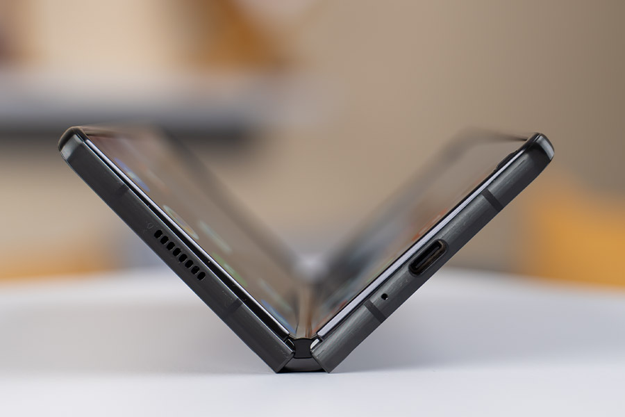 However, because of its relatively small diameter, getting it to work with a folded Z Fold 2 was a challenge sometimes. That’s because my thumb (or at least some portion of it) would reach out to the other frame instead of the one with the fingerprint sensor. Additionally, the top & bottom left frame hold the stereo speaker setup, while a USB-C port lies at the bottom right.