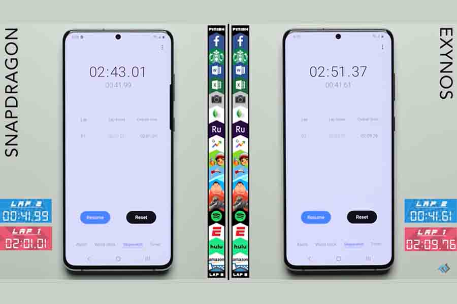 To check if both variants performed the same, they were put through a test where both the phones were loaded with a set of popular apps in the course of two laps. The first lap was designed to see which SoC launched the apps faster.
