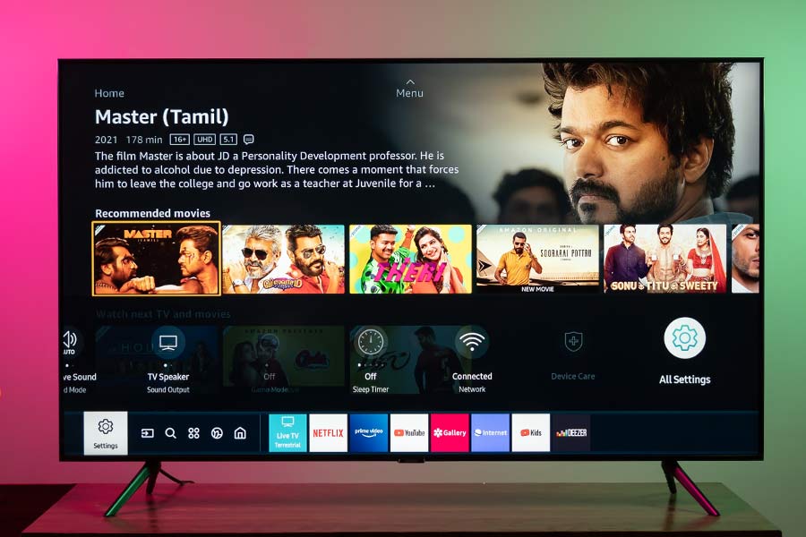 Finally, allow me to discuss the remote. Compared to the one from 2019’s RU7100, Samsung’s One Remote hasn’t seen a considerable change in design language. It is still as minimalistic as ever and the tactile feedback is incredible too. The One Remote is comfortable to hold and also gains a bit of heft with the battery installed. With this, it doesn’t end up feeling too light and cheap.