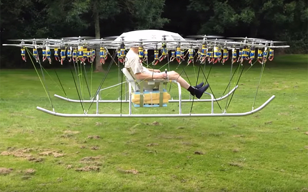 Super Drone is a combination of multiple drones. A British invention 'Super Drone' that consists of 54 propellers is able to fly a human in the air. The airborne time is limited to just 10 minutes on a single battery charge and seems to climb to a height of around 15 feet. But that's impressive none the less!