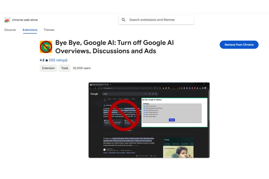 If you don’t want to go with all the above hassle, there is an easy peasy trick to remove Google AI Overview. You can simply add an extension called “Bye Bye, Google AI” to your Chrome from the Chrome web store and it will show the necessary results only.