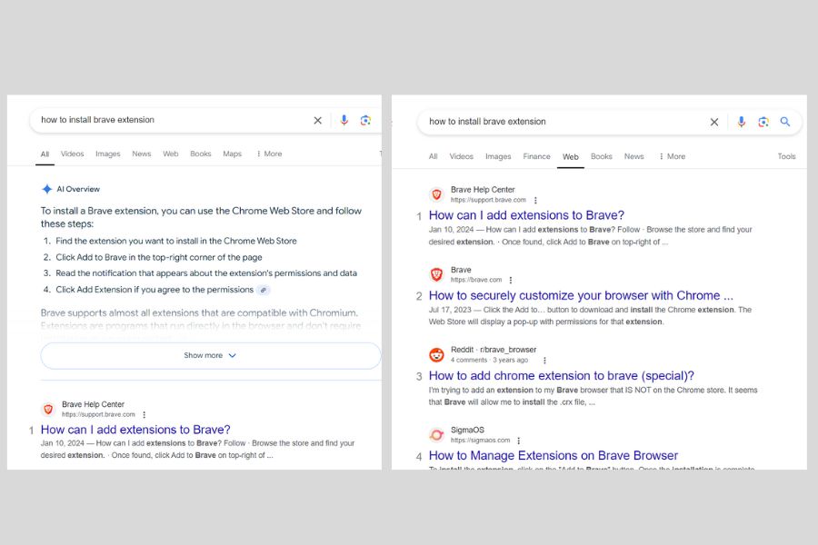 When the user adds &udm=14 to a Google search URL, it forces Google to show classic results. You can test this by adding “&udm=14” to the end of any Google search URL. The image below shows the before and after results of the search bar.