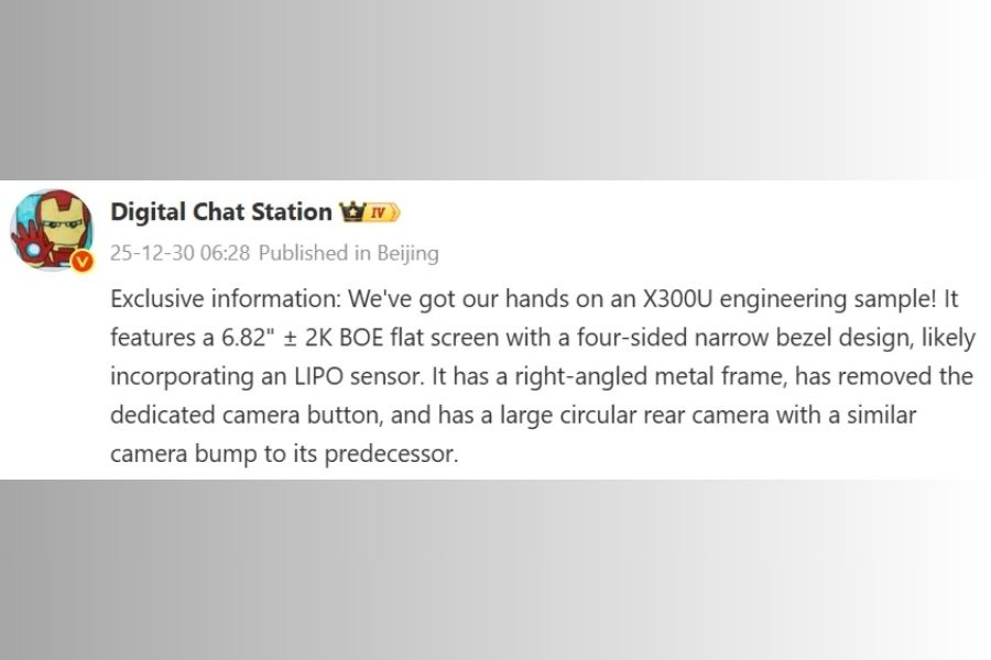 In terms of display, the X300 Ultra will sport a 6.82-inch BOE AMOLED panel with 2K resolution on top. It will feature a four-sided narrow-bezel design. As a flagship phone, it will for sure implement the LTPO tech for adaptive refresh rates.