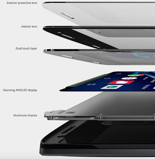 The Screen has 5 layers designed to absorb shock and uses flexible AMOLED display: