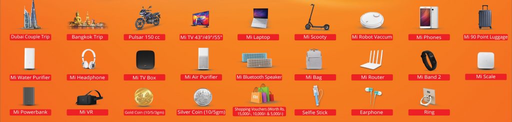 There are plenty of Mi products as gift hampers as well. Products include: Mi TV(+40’ inches), Mi Laptop, Mi Scooty, Mi Robot Vacuum, Mi Phone, Mi Luggage, Mi Water Purifier, Mi Headphone, Mi TV Box, Mi Air Purifier, Mi Speaker, Mi Bag, Mi Router, Mi Band 2, Mi Scale, Mi Powerbank, and Mi VR. Most of the goodies are utilitarian products and would facilitate well for your daily use. Apart from these, you’ll also get gold and silver coin. And the smallest gifts are ear phone and mobile ring. You'll also get shopping vouchers worth Rs.15,000, Rs.10,000 and Rs.5,000.